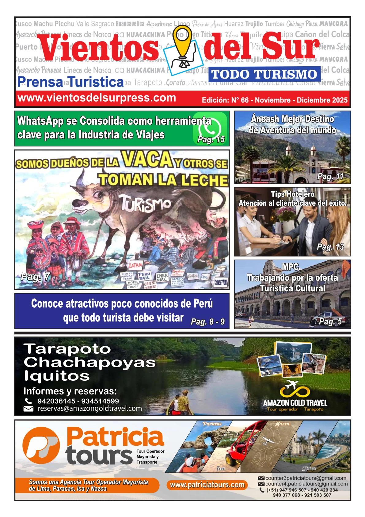 Vientos del Sur, pone al servicio de los empresarios de la industria del turismo nacional e internacional su periódico impreso y digital, para que puedan realizar sus anuncios publicitarios, llegar a más clientes hacer presencia y hacer más conocida los servicios que ofrecen para los viajeros, información importante para los agentes de viajes; El periódico será entregado por gentileza a todos los asistentes, expositores y representantes de la cadena turística por agencias mayoristas, operadores de turismo, líneas aéreas, hospedajes, representantes de destinos internacionales y proveedores de la industria de viajes.
